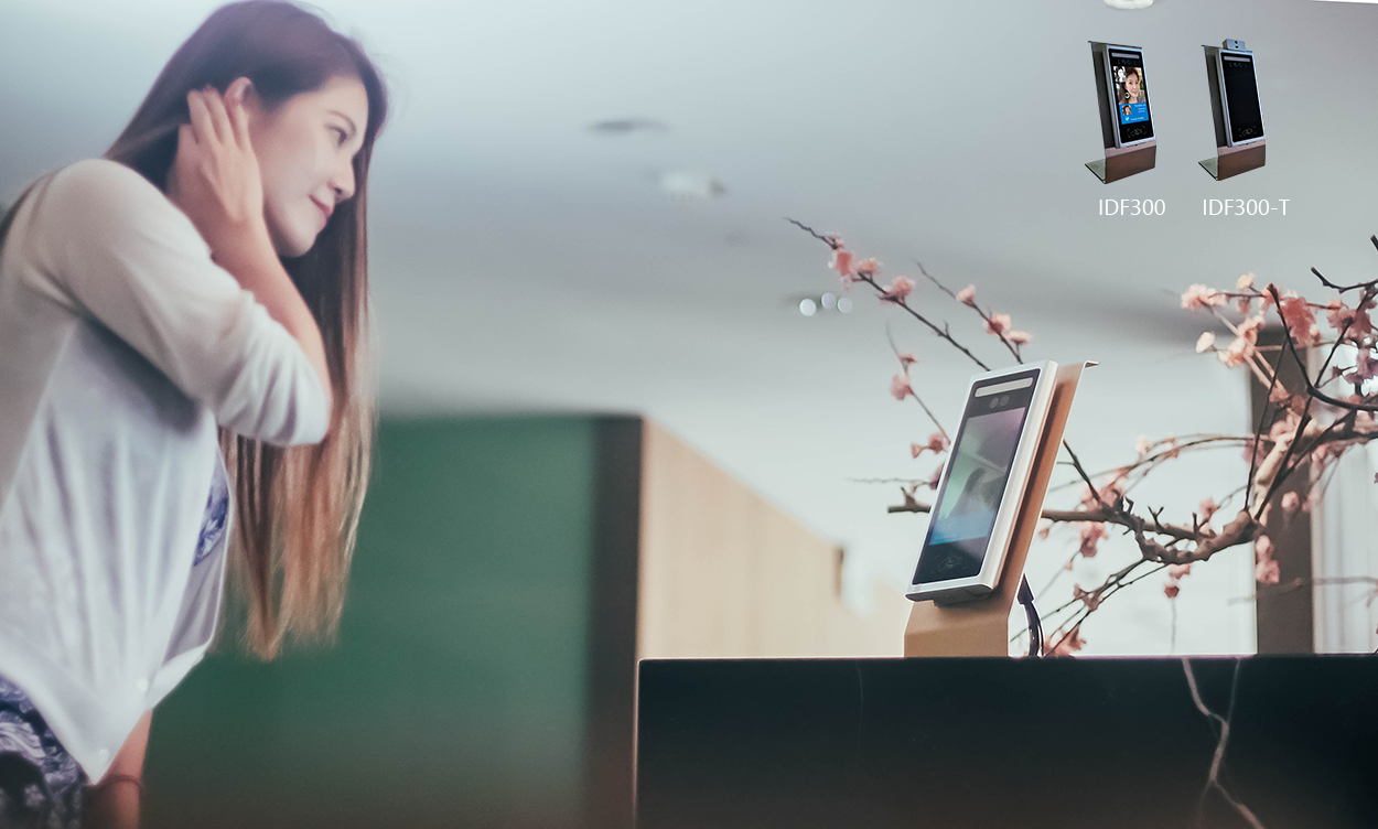 IDF300/IDF300-T Face recognition time clock; face recognition access control; face recognition time terminal. Face Recognition Time Clock / Access Controller Proximity / WiFi / 7-inch Touch Screen 1. Dynamic face detection and tracking 1:N recognition algorithm. 2. Reading distance: 1.5 meter(50 cm when temperature detection is enabled); verification speed: in 0.3 sec.. 3. 100,000 face templates + 1,000,000 logs. 4. True acceptance rate >99%. Wearing masks or making gremaces does not affect recognition correctness. 5. Working temperature: -20 ~ 50°C(-4 ~ 122°F). 6. Provides Mask Detection feature which, once switched on, stops recognition and requests users to put on face masks first. 7. Body temperature measuring function available as an option(IDF300-T). System alerts when measured temperature exceeds the top limit that you set to IDF300-T. 8. Dual-camera design effectively prevents buddy punching. 9. Open platform(Linux 3.1) for custom terminal(device) application development. 10. 7-inch touch screen(800*1280). 11. Provides Windows-based desktop application for managing multiple terminals on network. 12. Supports reading 125KHz or 13.56MHz(Mifare) cards. 13. Network connectivity: 10/100 Base-T Ethernet(RJ45) + WiFi 802.11b/g/n. 14. Comm port: TTL x 1; RS485 x 1; Wiegand Out x 1; Wiegand In x 1; Sensor input x 2; Relay output x 2.